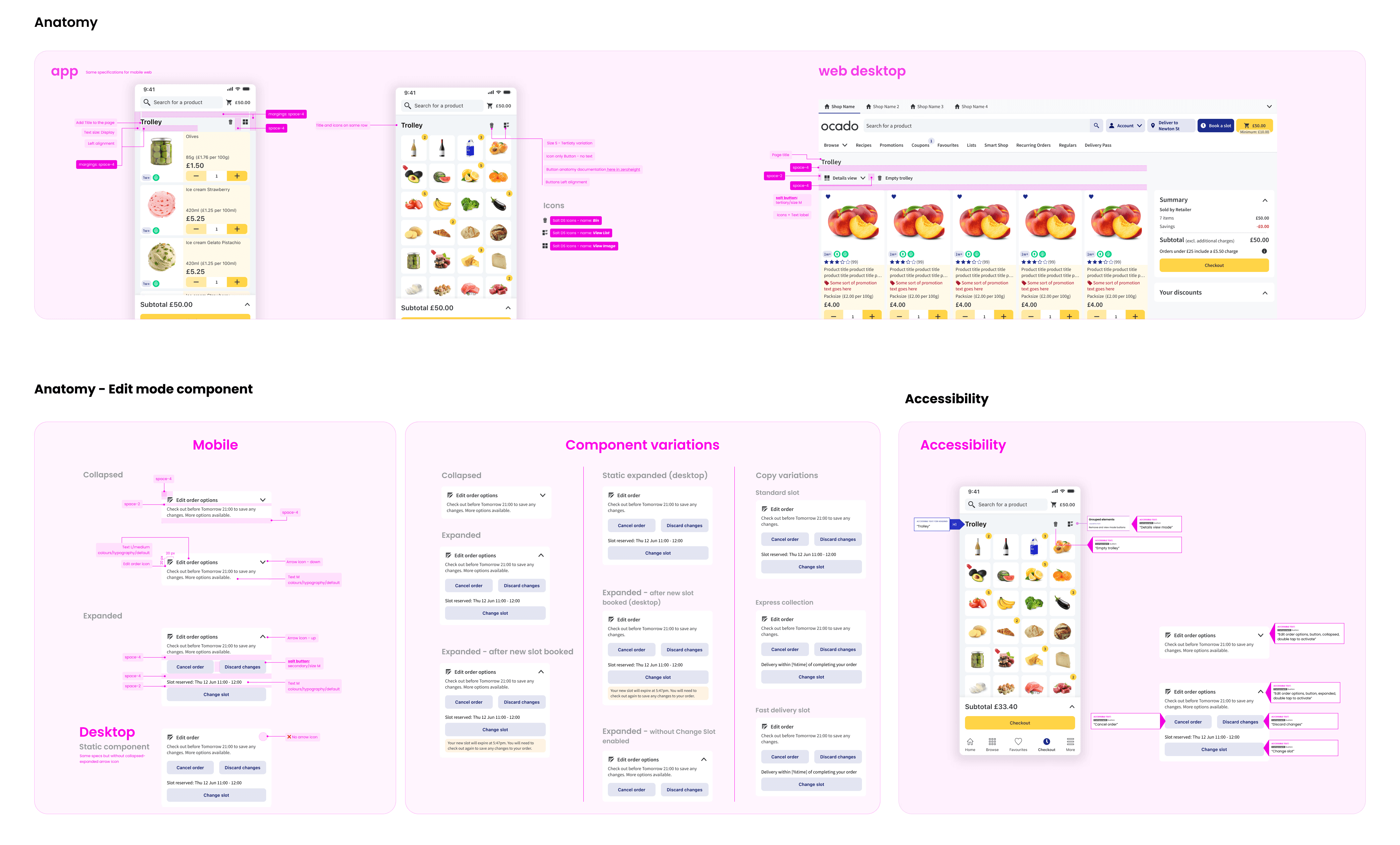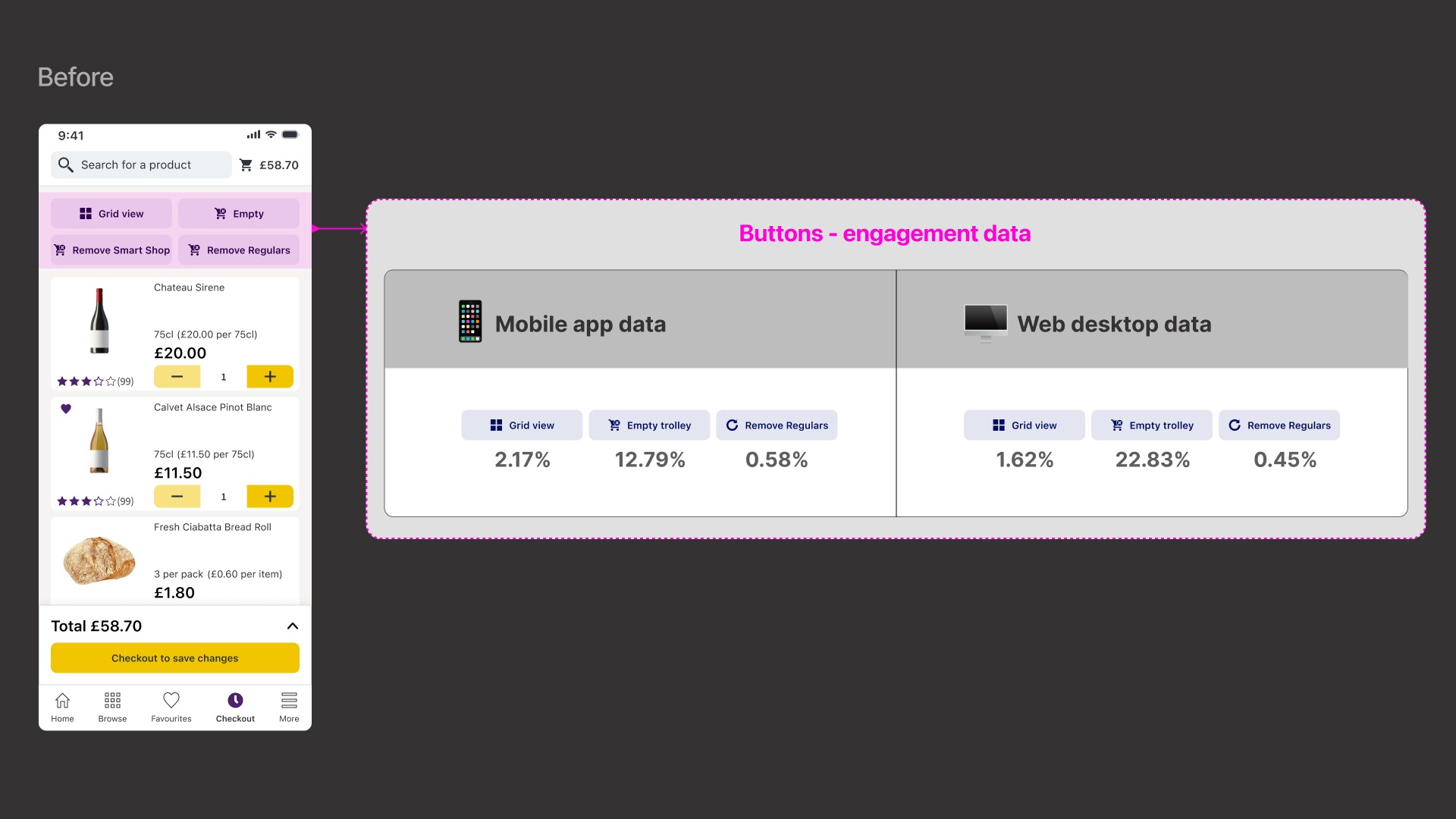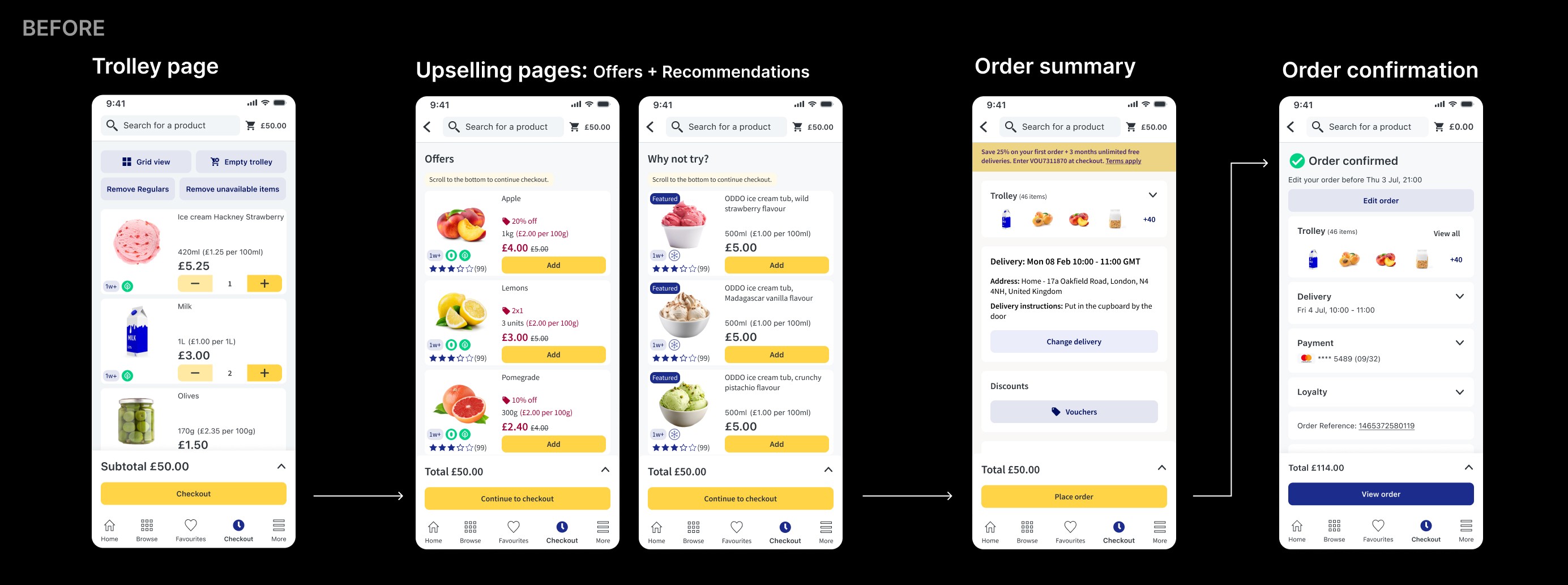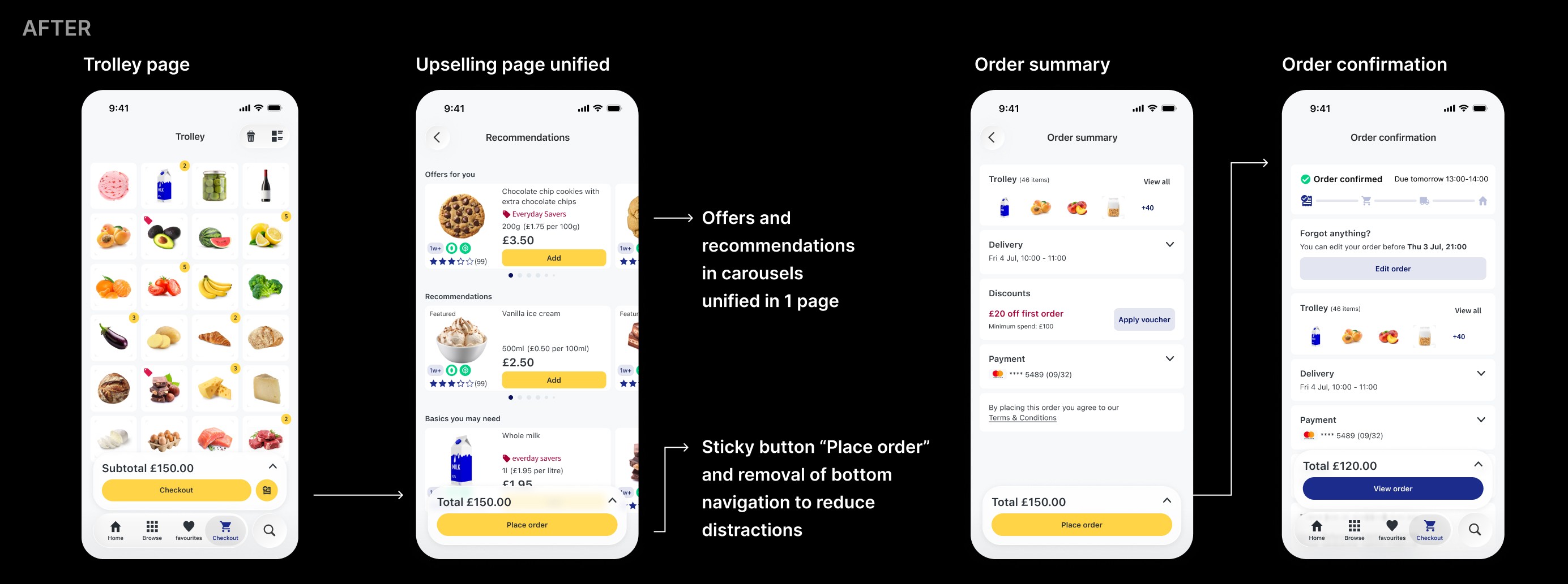 They often encountered out-of-stock items, forcing them to rebuild their basket after investing time; many reached checkout only to realise the minimum spend for delivery hadn’t been met, blocking completion; the trolley felt cluttered, making it harder to quickly review the order; vouchers and savings were hard to apply and easy to miss. And overall, the checkout flow included several upsell steps, adding unnecessary friction to the checkout experience.