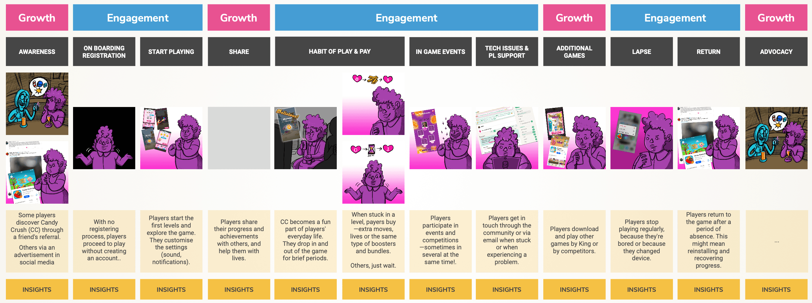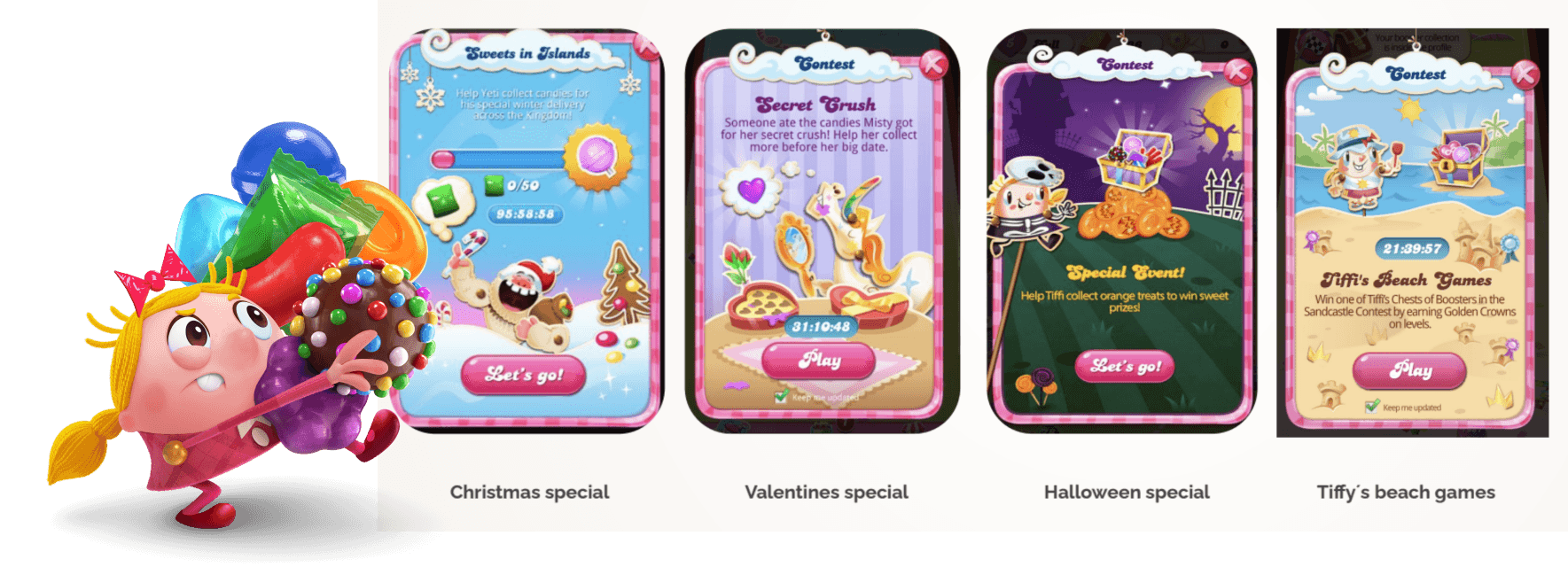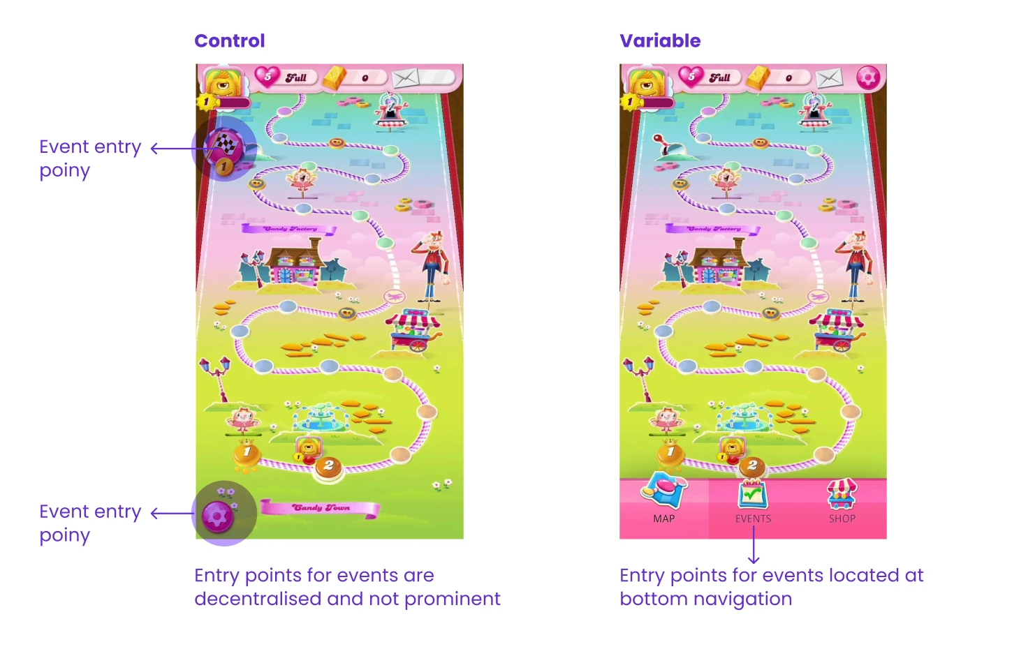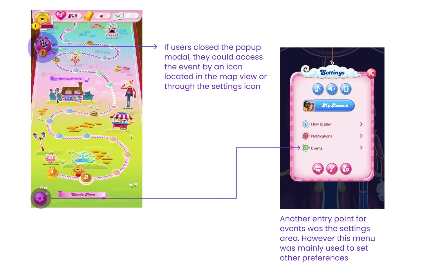 In Candy Crush, users can play additional mini-quests and events beyond the regular game progression (game levels). The goal of this initiative was to increase engagement in live events and delight users seeking continuous enjoyment, even when out of game lives, or exploring side events to make the experience more dynamic.