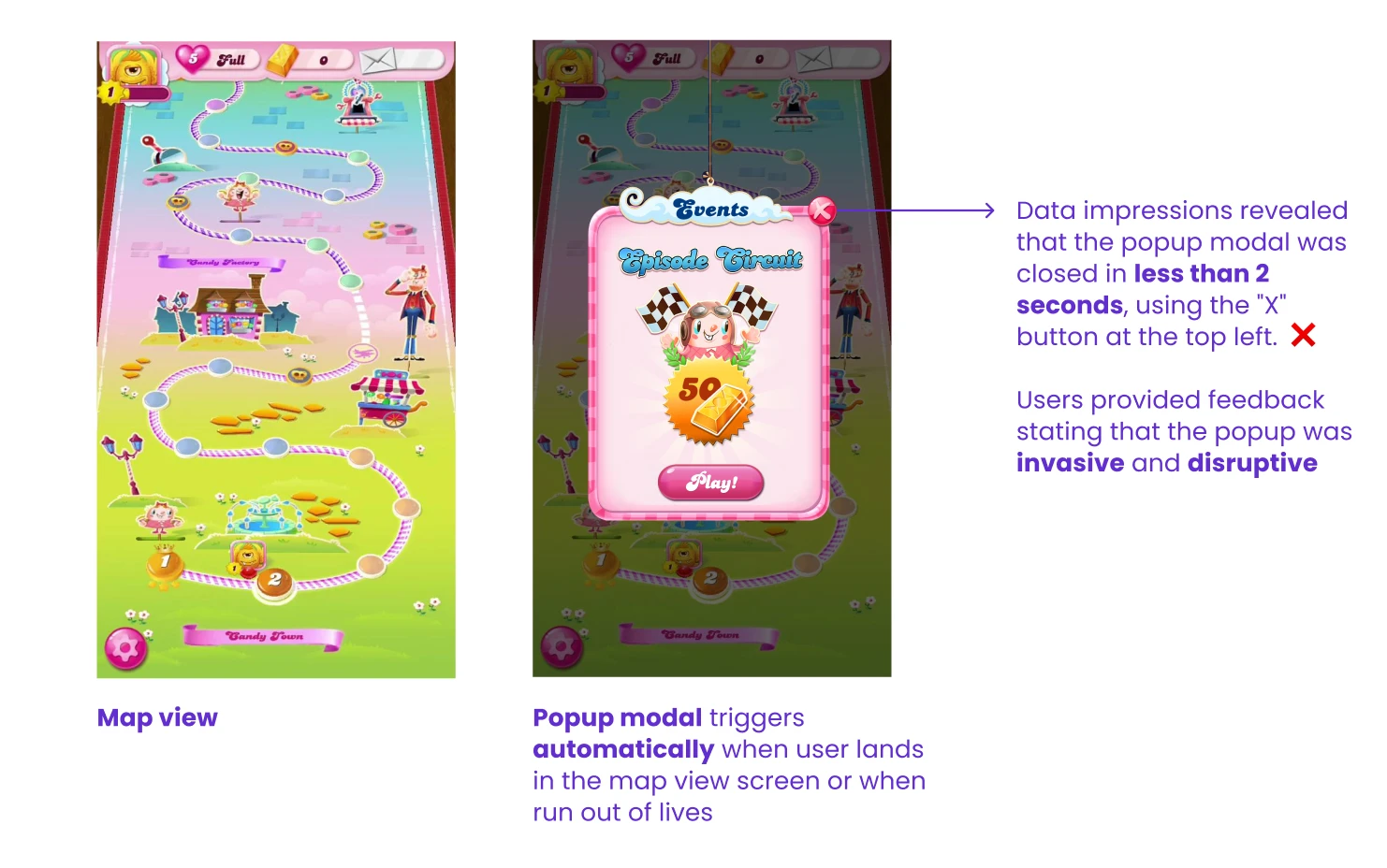 Feedback from players found in the player forum community of King’s website revealed excitement and provided insights that Events was a great feature to improve player retention. However, data indicated a need for enhanced engagement. A survey was conducted among players participating in live events, and the feedback highlighted that players perceived the popup as intrusive and disruptive to the game flow, negatively impacting their overall experience.